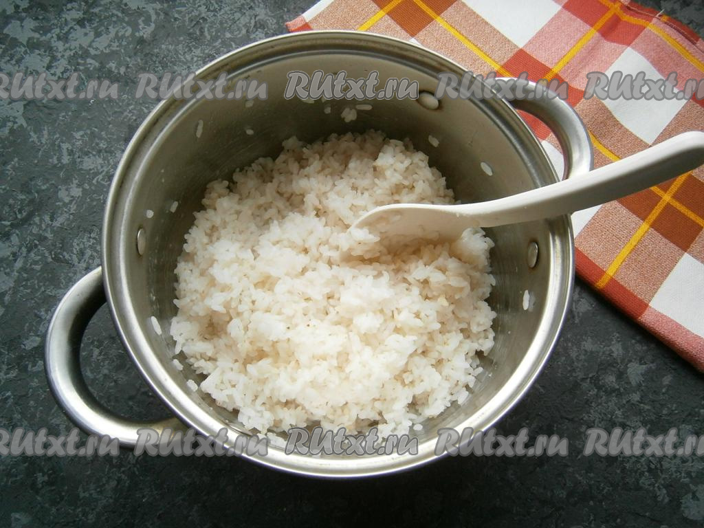 Готовый теплый рис полить заправкой и перемешать его ложкой, начиная от краев и переходя к центру кастрюли (так заправка равномерно смешается с рисом).