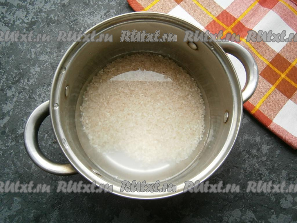 Рис всыпать в кастрюлю с толстым дном. Теперь его нужно очень хорошо промыть водой. Промывать рис нужно несколько раз (лучше 3-4 раза), до тех пор, пока вода не станет полностью прозрачной. Далее воду полностью слить.