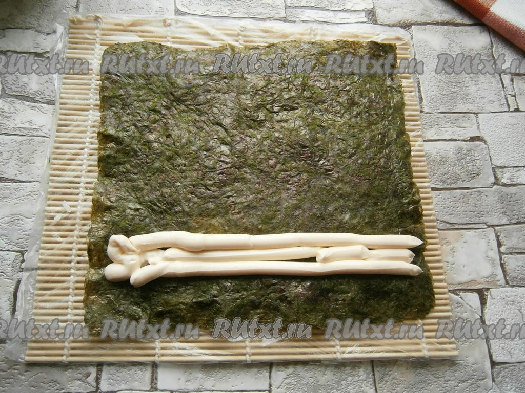 Ближе к нижнему краю листа нори выдавить 2-3 полоски сливочного сыра, выложив его предварительно в кулинарный мешок с обрезанным концом.
