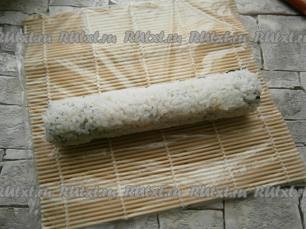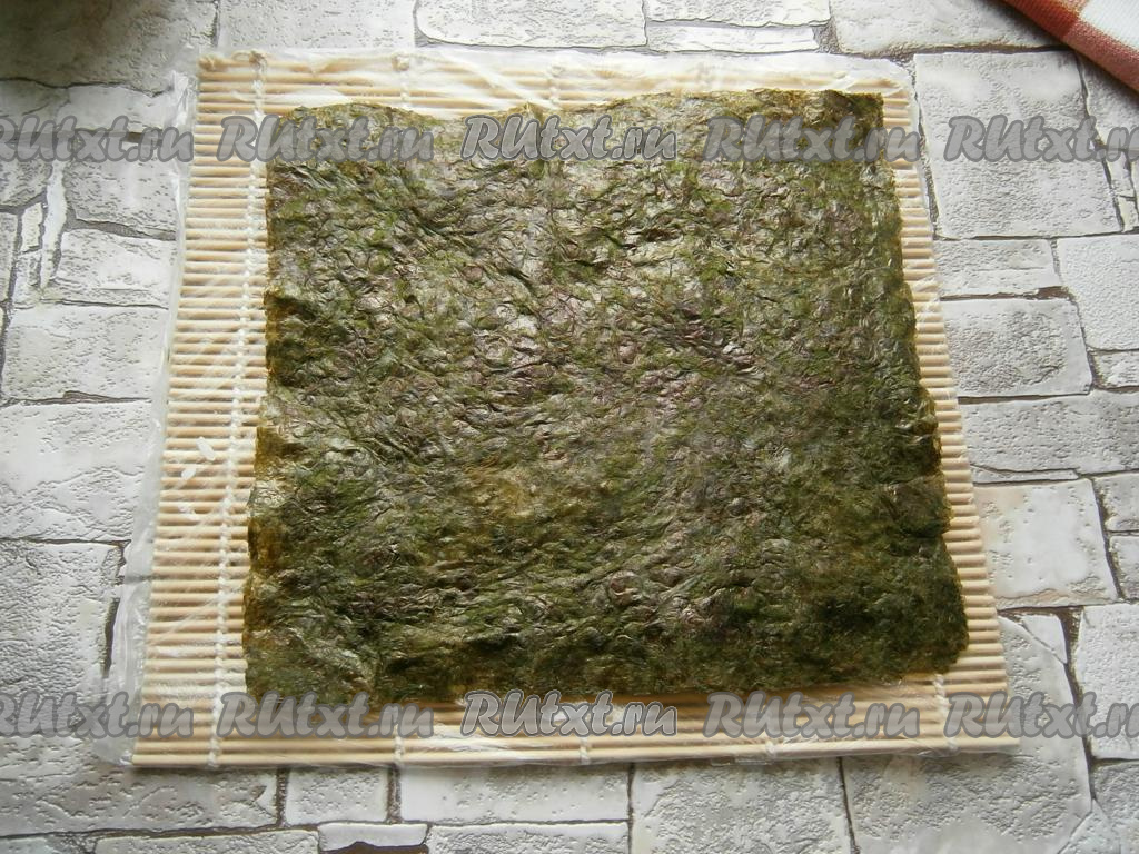 Лист нори вместе с рисом перевернуть (удобно переворачивать с помощью еще одной циновки, накрыв ею рис и просто перевернув).