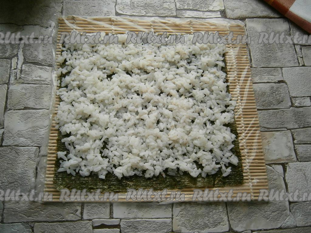 На циновке расположить лист нори шершавой стороной кверху. Разложить на нем слой риса, не доходя до нижнего края листа около 1 см (как на фото).