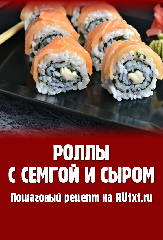 Разрезать ролл очень острым, чуть смоченным в воде ножом, на 6 равных частей (неровные края обрезать). Разместить роллы на тарелке, сверху выложить тонкие и продолговатые кусочки семги. Подать невероятно аппетитные роллы, приготовленные с семгой и сыром, к столу с васаби, соевым соусом и маринованным имбирем. Очень вкусно!