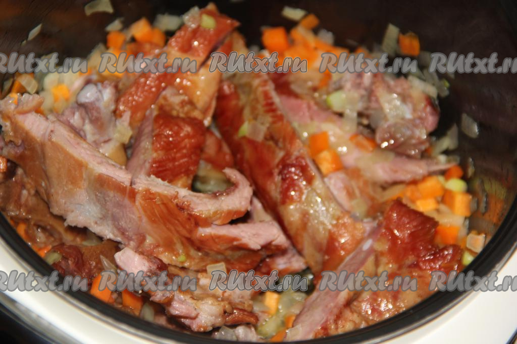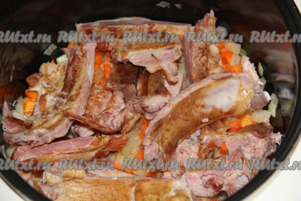 Добавить в чашу нарезанные (или порубленные) на небольшие кусочки копченые рёбрышки.