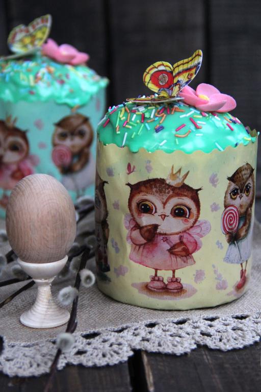 Я покрыла куличи сахарной глазурью и слегка её подкрасила пищевым красителем. Для приготовления глазури нужно в 200 грамм сахарной пудры чайной ложкой постепенно добавить лимонный сок (или воду), постоянно перемешивая. В конце добавить в глазурь краситель, перемешать. Глазурь должна получиться однородной, по консистенции, как сгущённое молоко.