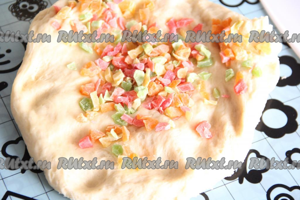 Затем снова обмять тесто. Тесто для приготовления куличей готово, я разделила его на две части. В одну часть теста я добавила цукаты.