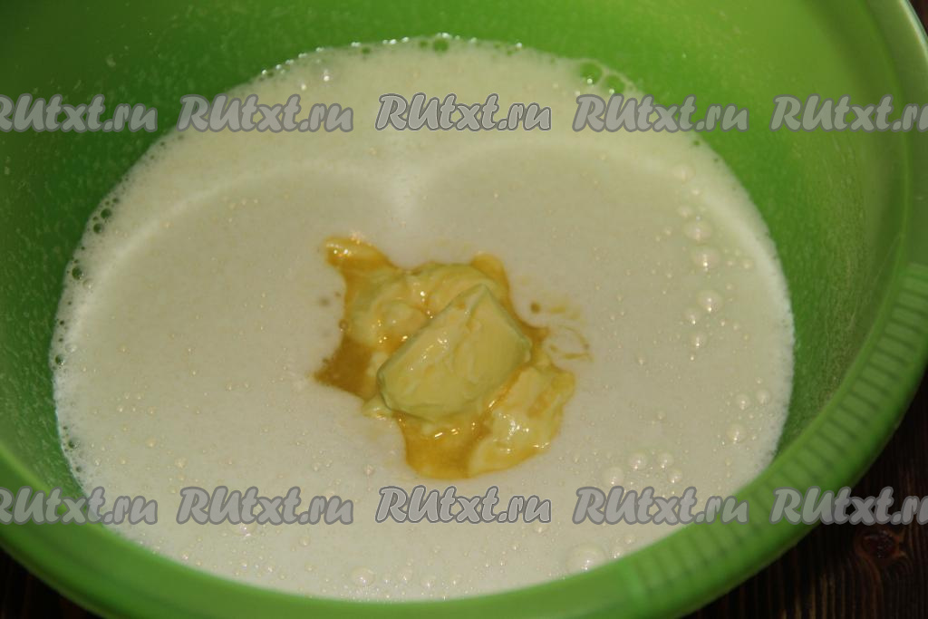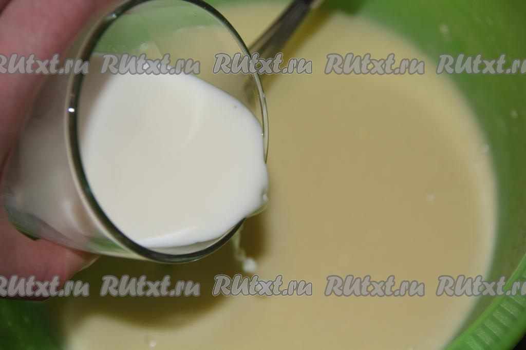 Далее добавить тёплое молоко и перемешать.