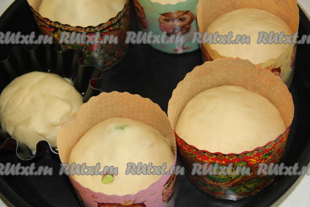 Разложить тесто по формам для выпечки куличей (я выпекала в бумажных формах), заполняя их на половину объёма. У меня получилось 6 куличиков среднего размера. Оставить тесто в формах в тёплом месте на 1 час.