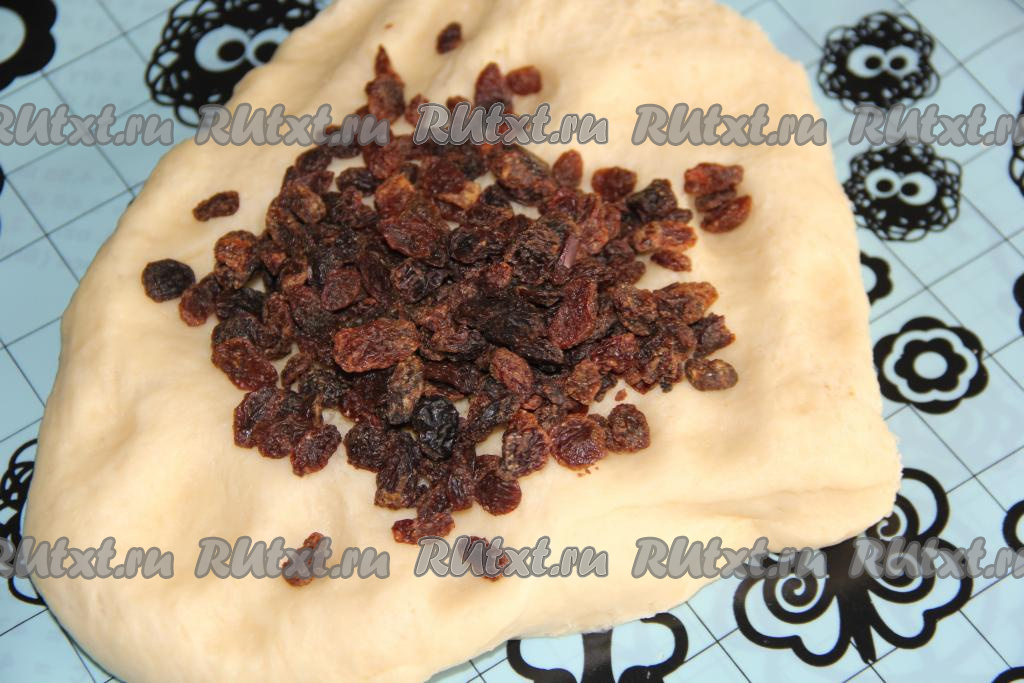 А в другую часть теста добавила изюм. Хорошо подмешать изюм и цукаты в тесто.