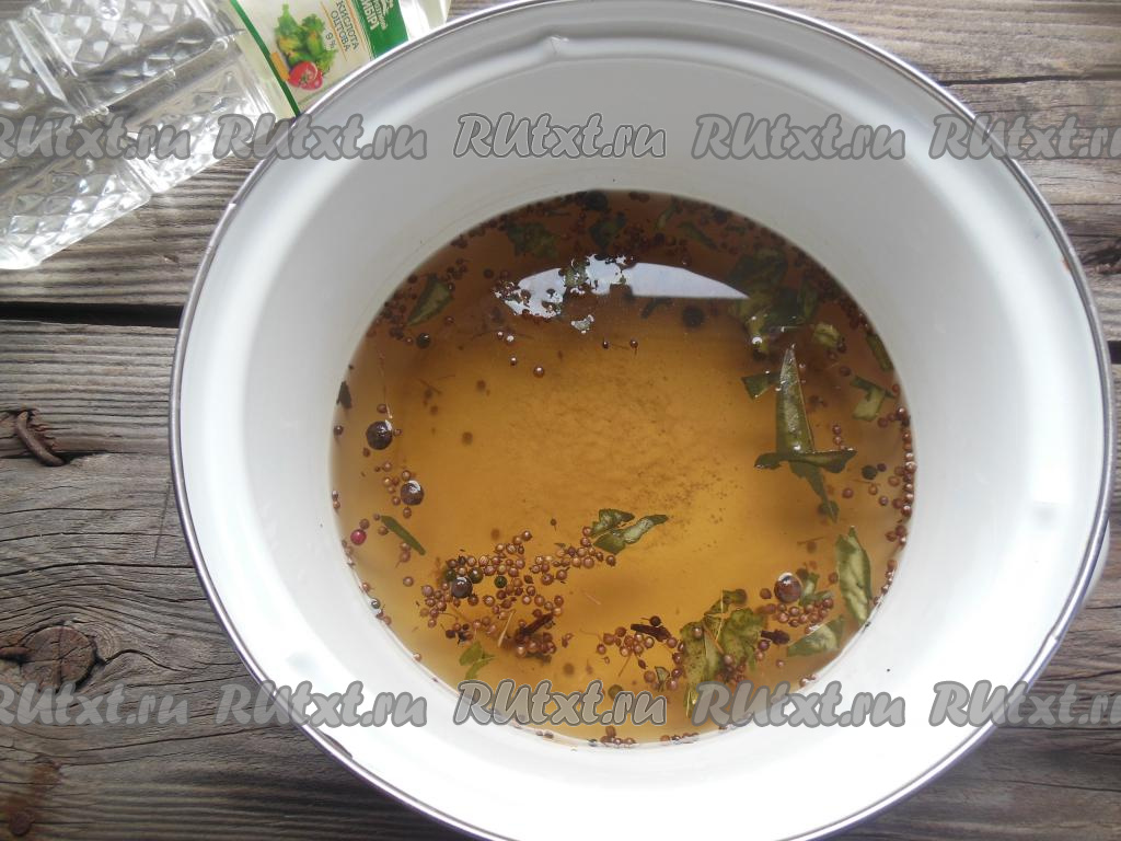 Кастрюлю с маринадом снимите с плиты и дайте полностью остыть, в остывший маринад влейте уксус.