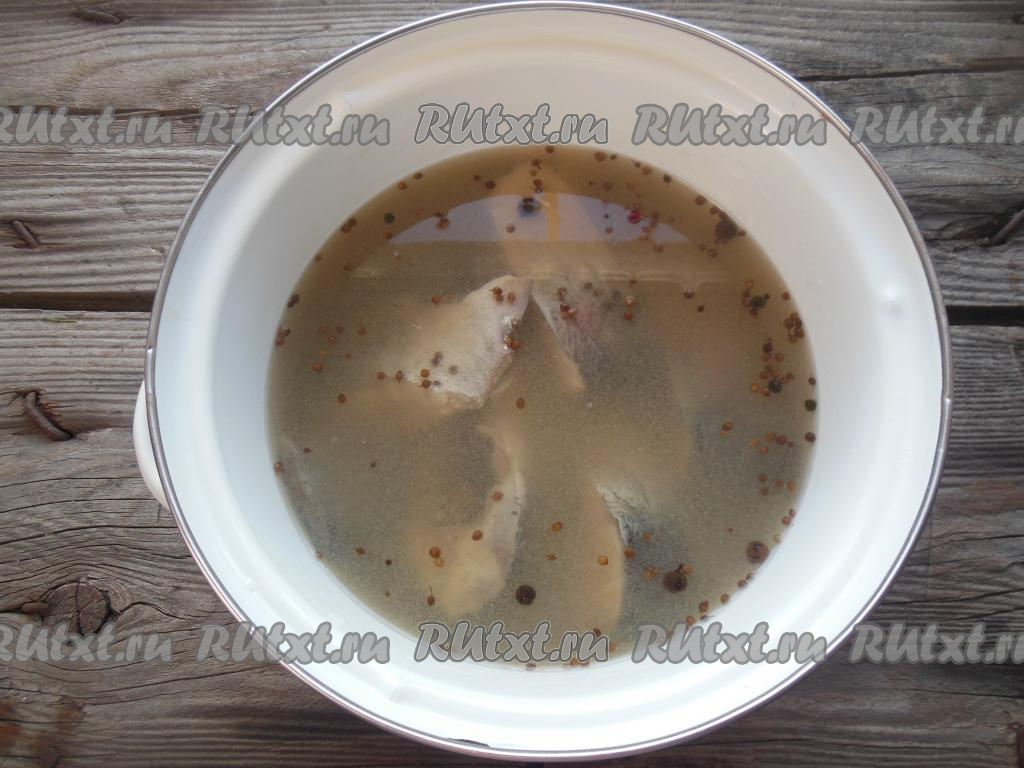 Кастрюлю с кусочками толстолобика в маринаде сверху накройте тарелкой, чтобы рыба была полностью покрыта жидкостью. Уберите в холодильник на двое суток.