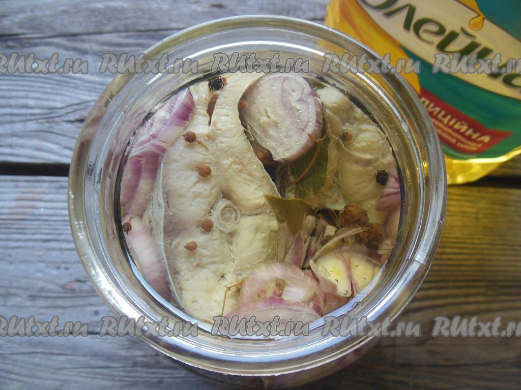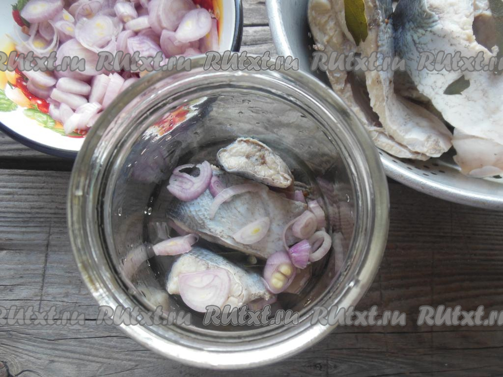 В банку выкладывайте слоями поочередно рыбу и нарезанный репчатый лук.