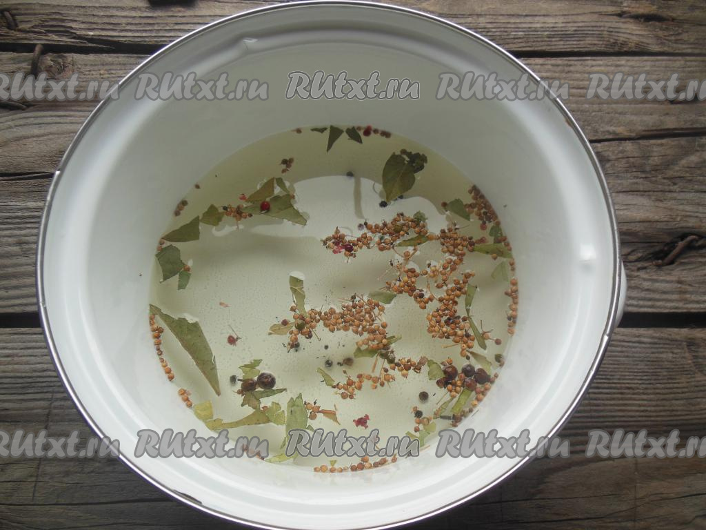 В кастрюлю влейте воду, добавьте соль, сахар, лавровые листья, зерна кориандра, смесь перцев горошком, гвоздику, душистый перец горошком, доведите до кипения, варите маринад 2-3 минуты.
