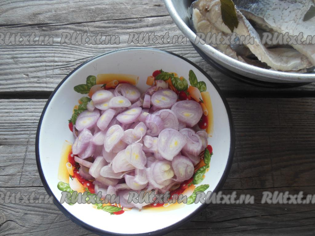 По прошествии двух суток достаньте кусочки толстолобика из маринада и переложите в дуршлаг, чтобы стекла жидкость. Репчатый лук очистите, нарежьте на кольца (или полукольца).
