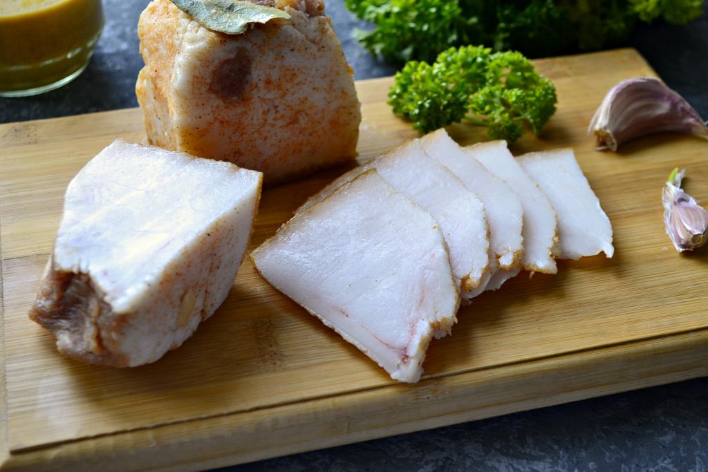 Часть кусков сала, завернутых в пергамент, нужно отправить на хранение в морозилку. Оставшееся сало можно либо сразу подать к столу, либо отправить в пергаменте в холодильник.