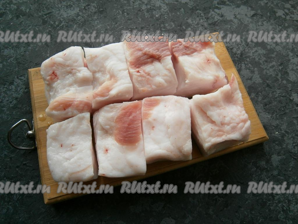 Чеснок очистить и нарезать на пластины. Пласт сала нарезать на куски шириной около 5-6 см.