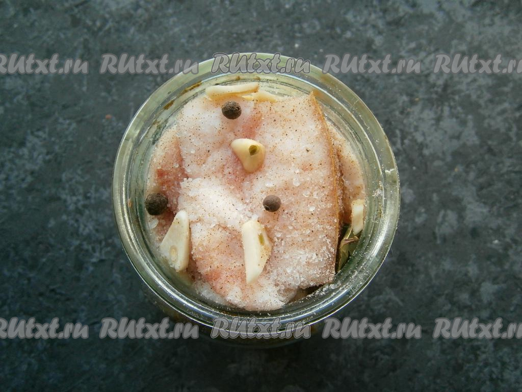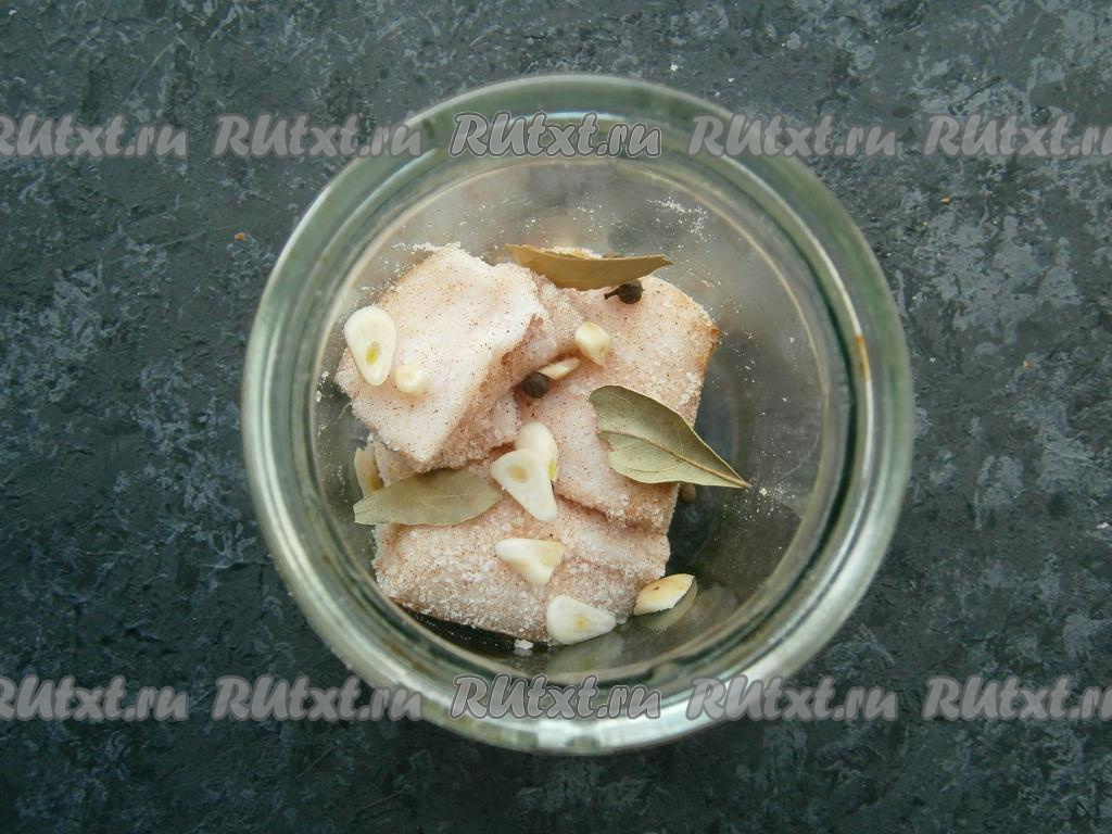 Далее складывать куски сала в чистую сухую банку, пересыпая пластинами чеснока, горошинами душистого перца и лавровыми листьями.