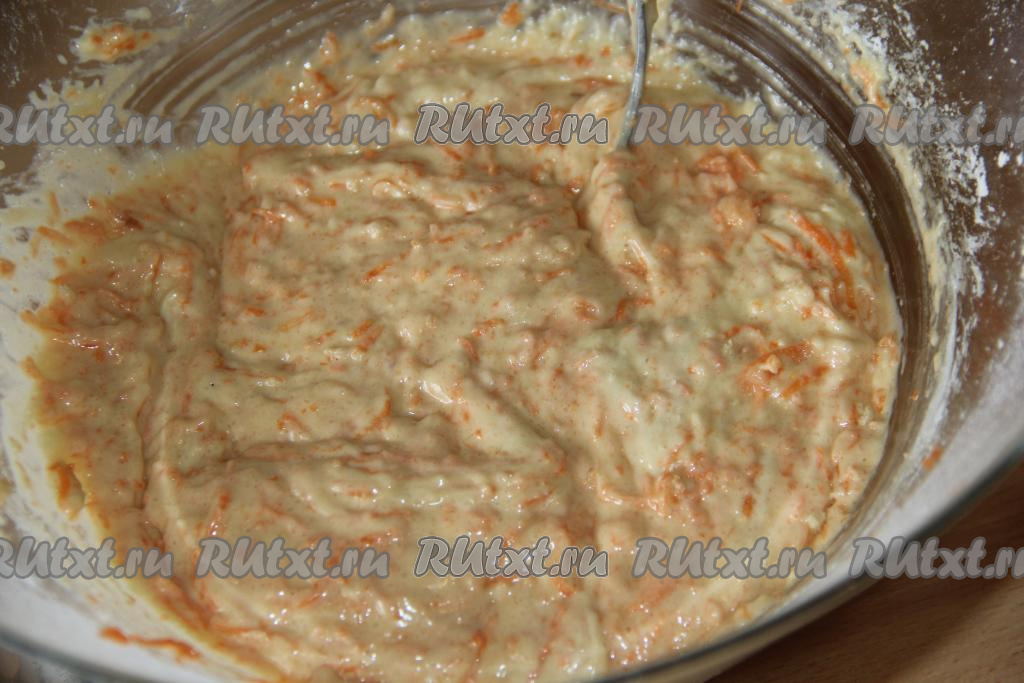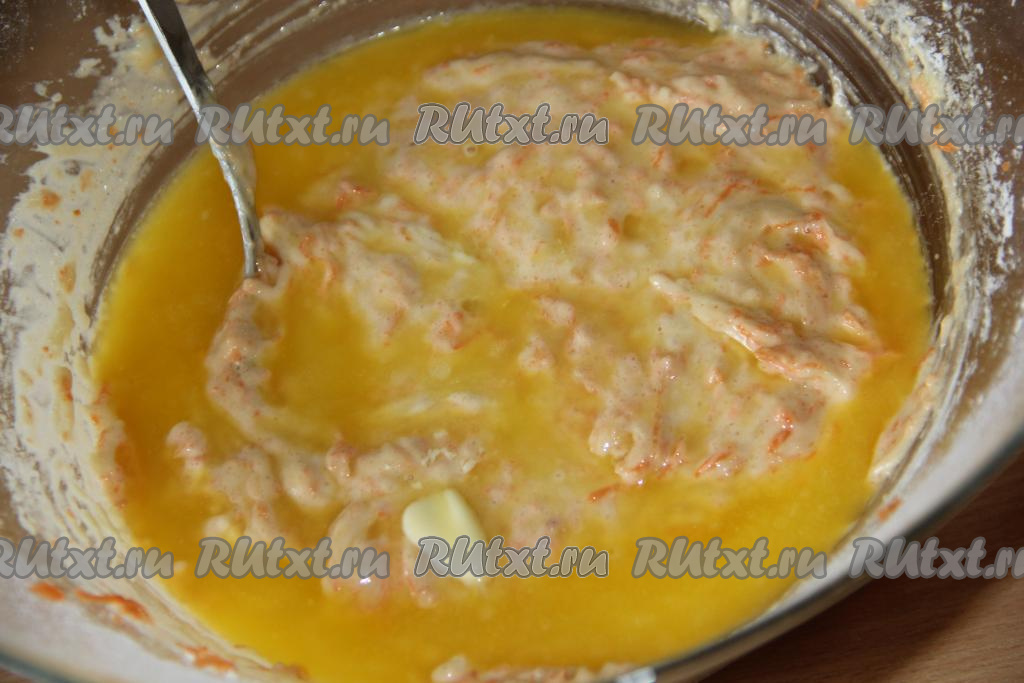Сливочное масло растопить (можно растопить в микроволновке), остудить и добавить в тесто, хорошо перемешать. Морковное тесто получится не очень густым.