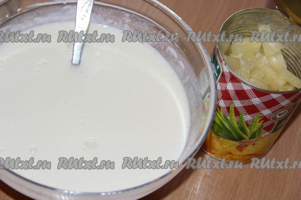 Влить желатин в смесь сметаны и сахара, хорошо перемешать сметанный крем. С консервированных ананасов слить жидкость. Если нужно, нарезать ананасы на кубики среднего размера (мелко резать не нужно).