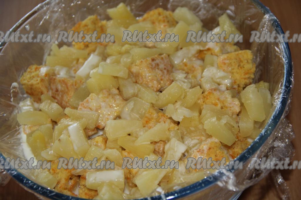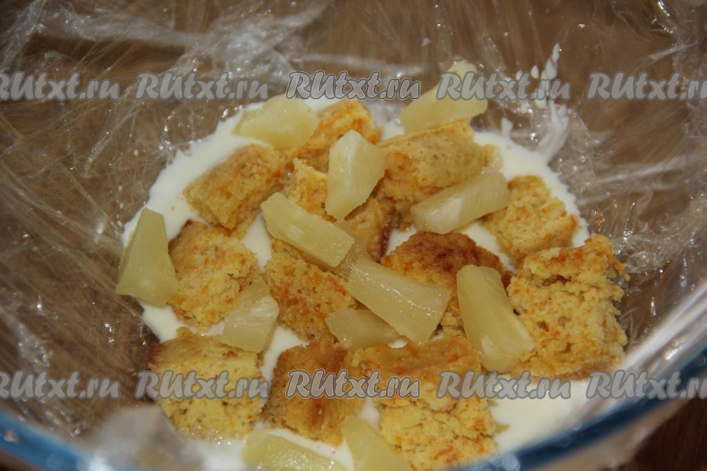 Затем выложить слой из кусочков бисквита и кусочков ананасов, полить сметанным кремом.