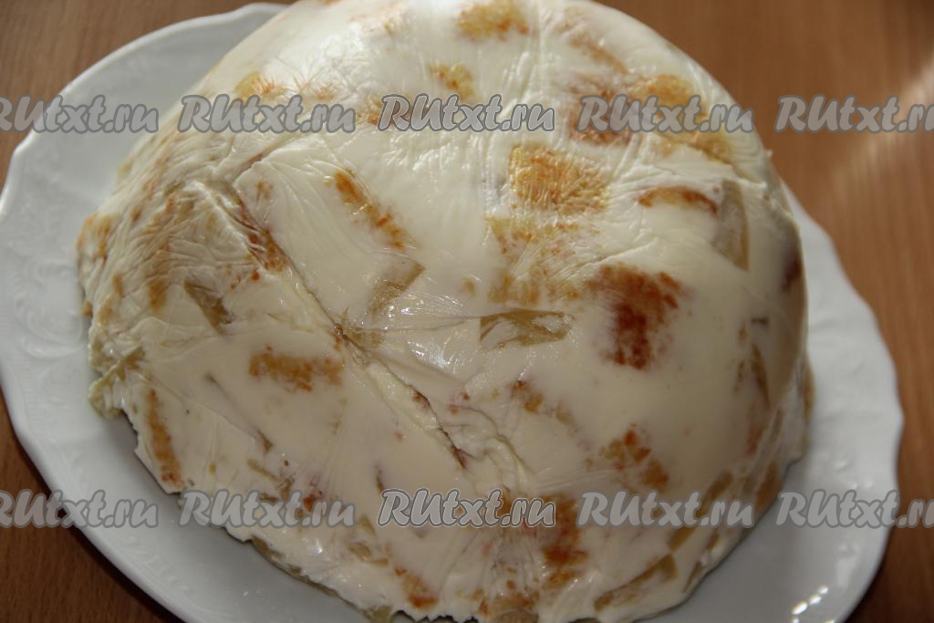 Таким образом, выкладывая слои кусочков бисквита и ананасов и поливая каждый слой кремом, собрать весь морковный торт. Выложить сверху, если остался, сметанный крем. Накрыть сверху торт пищевой плёнкой и слегка прижать. Убрать торт в холодильник на ночь (до полного застывания).