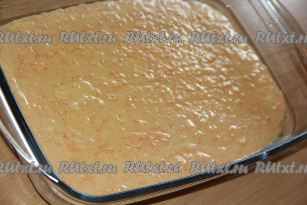 Форму для выпечки (у меня стеклянная форма размером 30х25 см) смазать растительным маслом, Выложить морковное тесто в форму, разровнять.