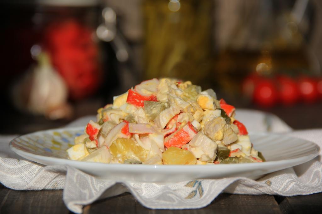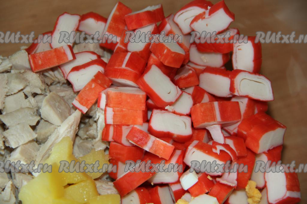 Салат с куриной грудкой и крабовыми палочками получается ярким, вкусным, очень нежным и достаточно сытным, попробуйте!