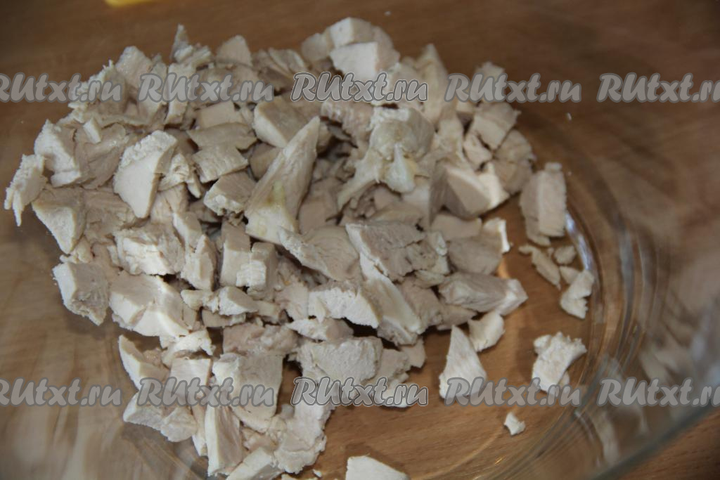 Куриную грудку предварительно сварить до готовности (в течение минут 30) в подсоленной воде и остудить. Нарезать вареную куриную грудку на кубики.