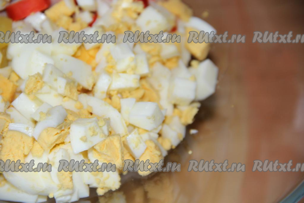 Яйца сварить, остудить, очистить, нарезать на кубики и выложить в салат.