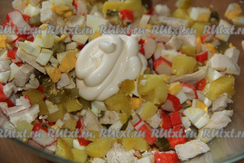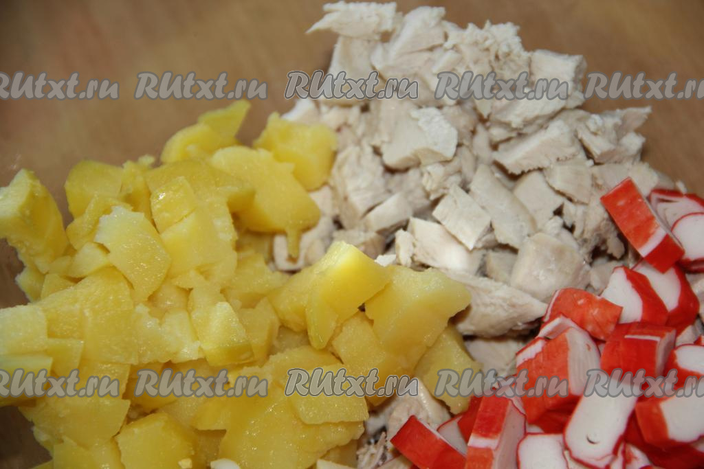 Крабовые палочки заранее разморозить при комнатной температуре, затем нарезать на средние кусочки и выложить в салат из картошки и куриной грудки.