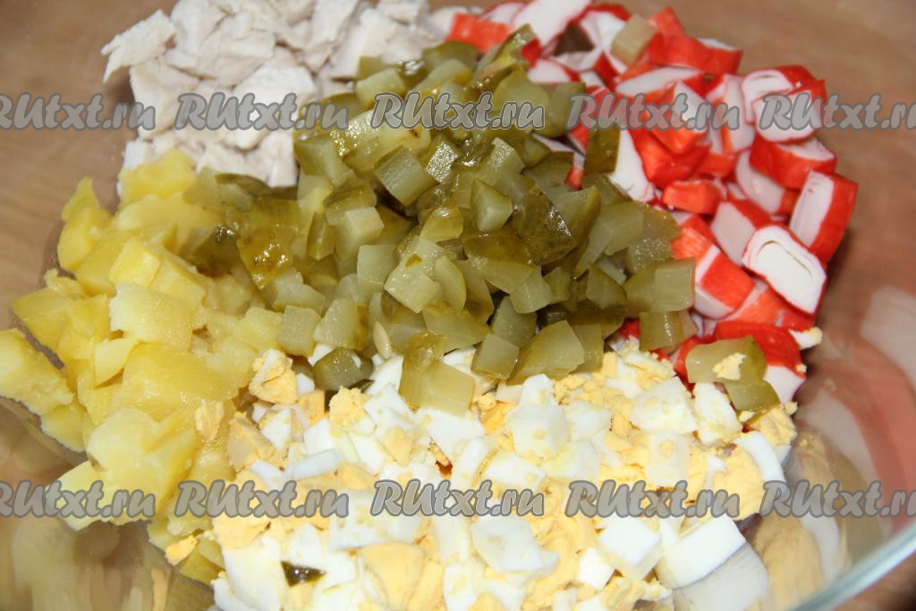 Маринованные огурчики нарезать на кубики и добавить в салат. Желательно, чтобы и огурцы, и картошка, и яйца, и крабовые палочки, и куриная грудка в этом салате были нарезаны на кубики, примерно, равной величины (не надо резать ни слишком крупно, ни слишком мелко).