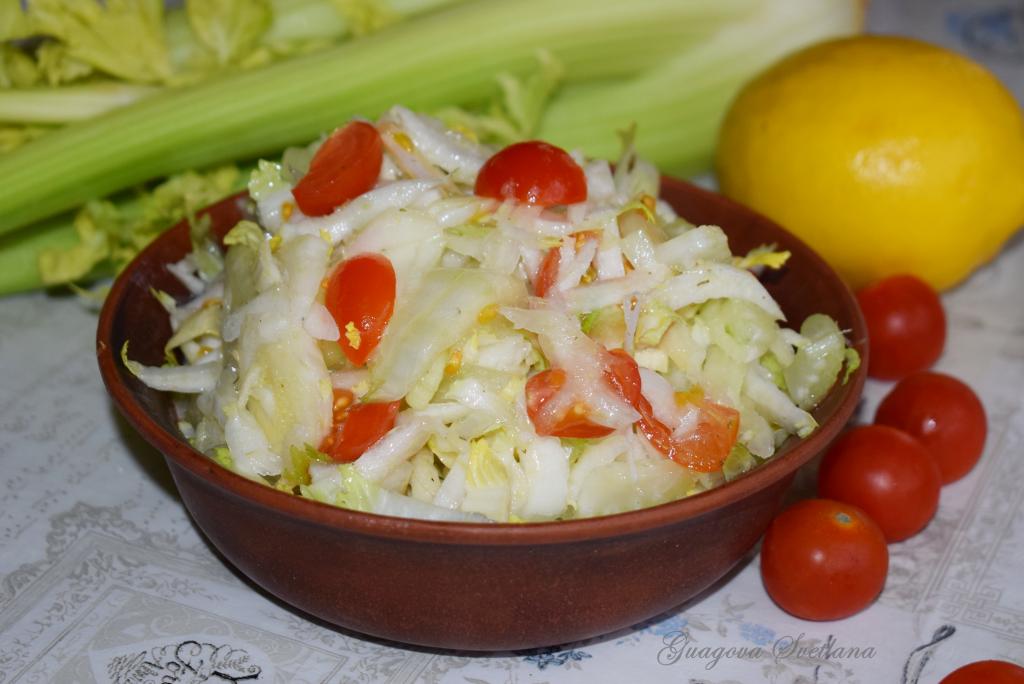 Полезный, вкусный, сочный, низкокалорийный - вот так можно охарактеризовать салат с сельдереем и пекинской капустой. Сельдерей является овощем с отрицательной калорийностью - это говорит о том, что на его переваривание расходуется больше калорий, чем он сам в себе содержит. Именно по этой причине сельдерей пользуется большой популярностью у людей, стремящихся к правильному питанию и снижению веса. Для разнообразия в такой салат можно добавить помидоры черри, огурцы, шпинат, петрушку или укроп. Каждый раз этот замечательный салатик будет играть новыми оттенками вкуса.