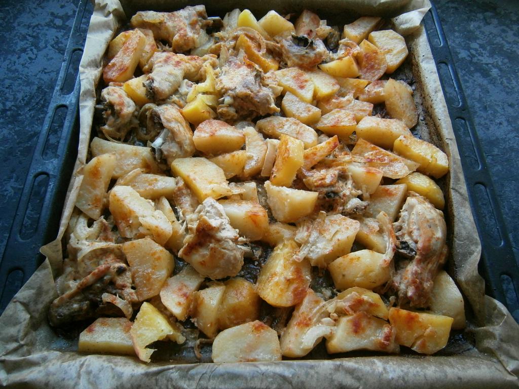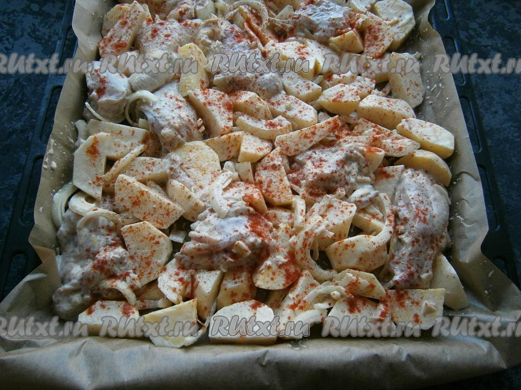 Противень застелить пергаментом, выложить на него курицу с соусом и луком, добавить картофель, перемешать прямо на противне и разровнять. Полить все растительным маслом, сверху посыпать паприкой.