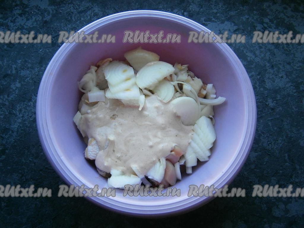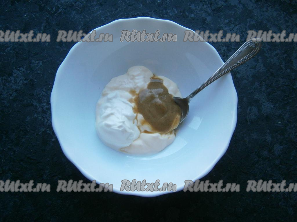 Приготовить соус: смешать сметану с майонезом, добавить горчицу.