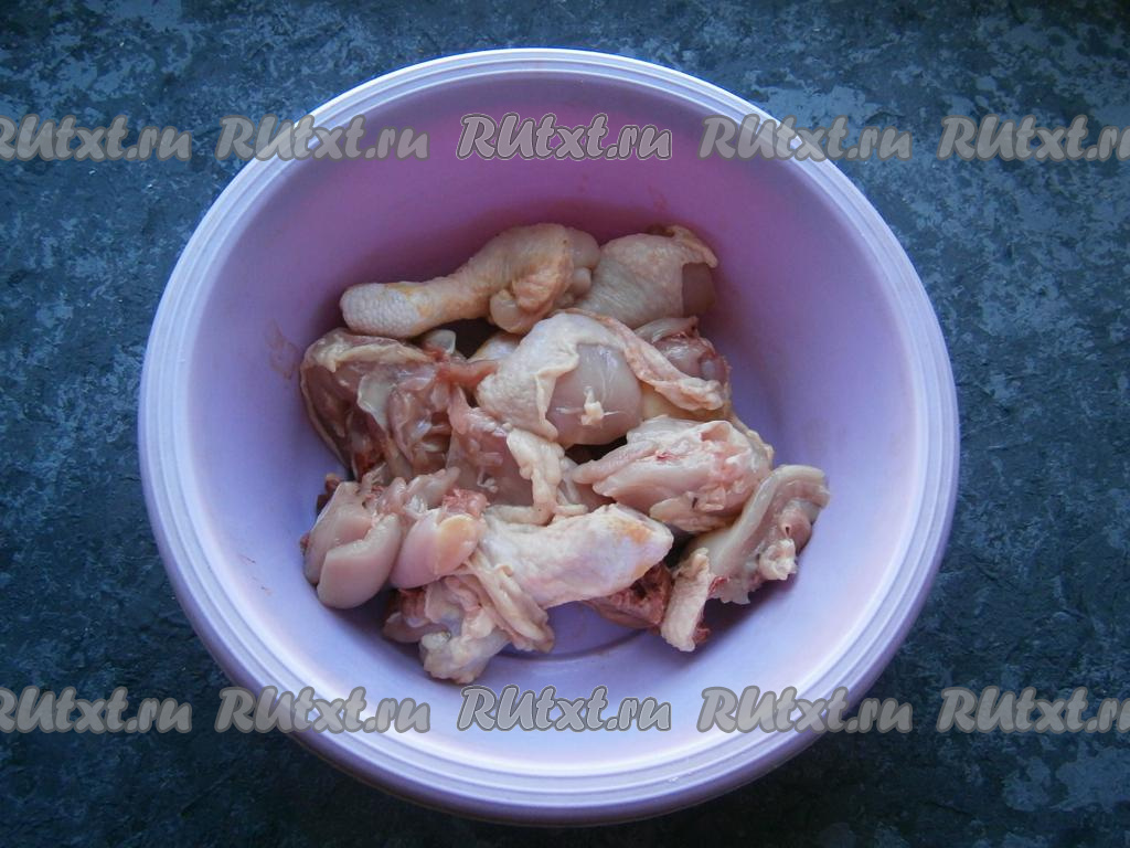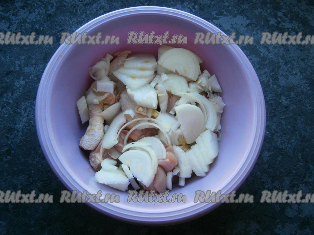 Лук, картошку и чеснок очистить. Курицу порубить на части.