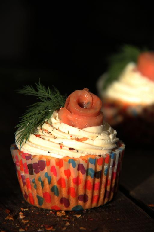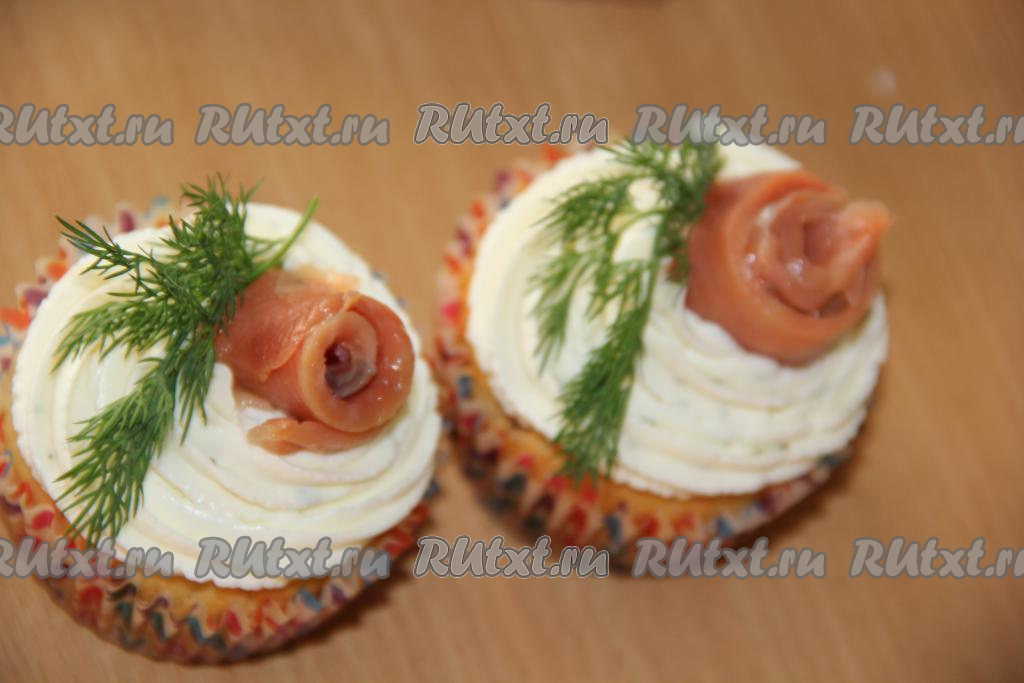 Тонкие ломтики сёмги свернуть в рулетик и вставить в середину сырной шапочки. Украсить закусочные кексы веточкой укропа и сухими пряностями.
