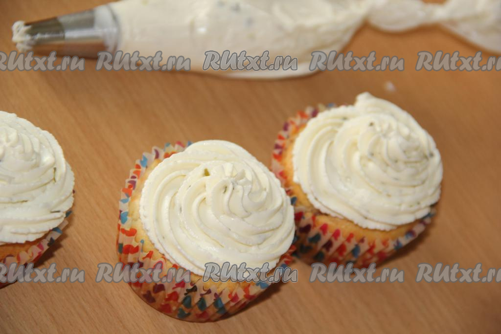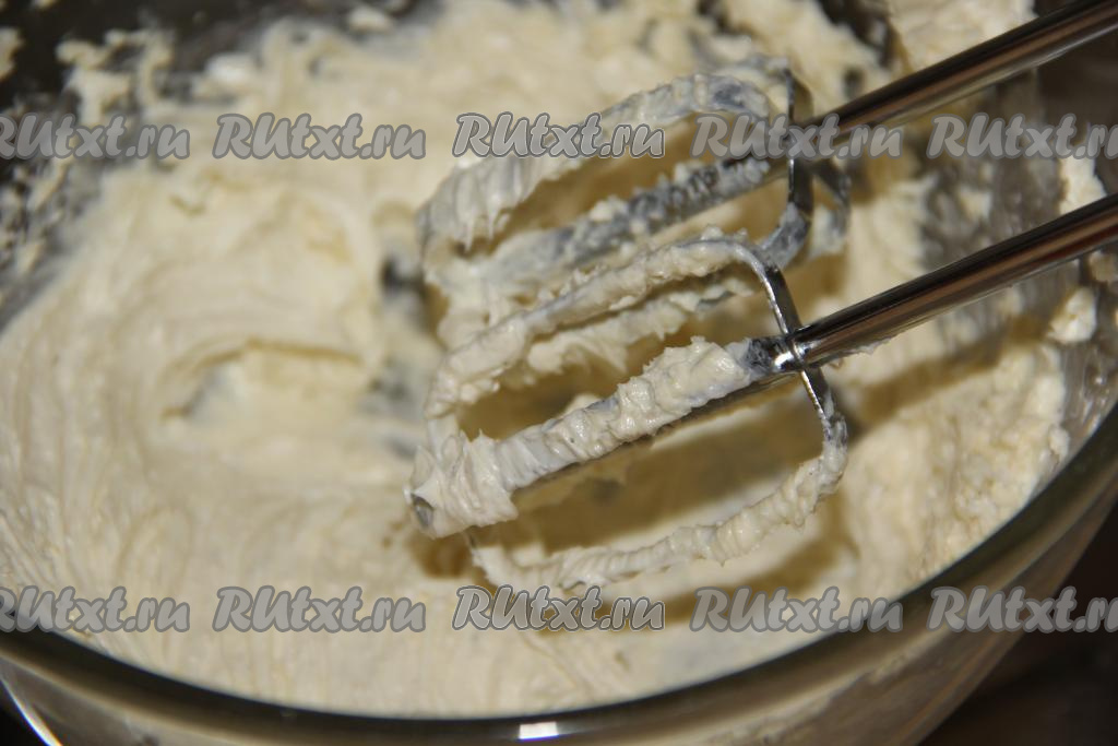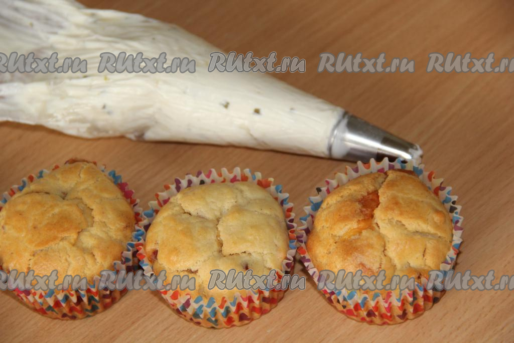 Сыр предварительно достать из холодильника (где-то за час до украшения выпечки). В кондитерский мешок с фигурной насадкой выложить творожный сыр.