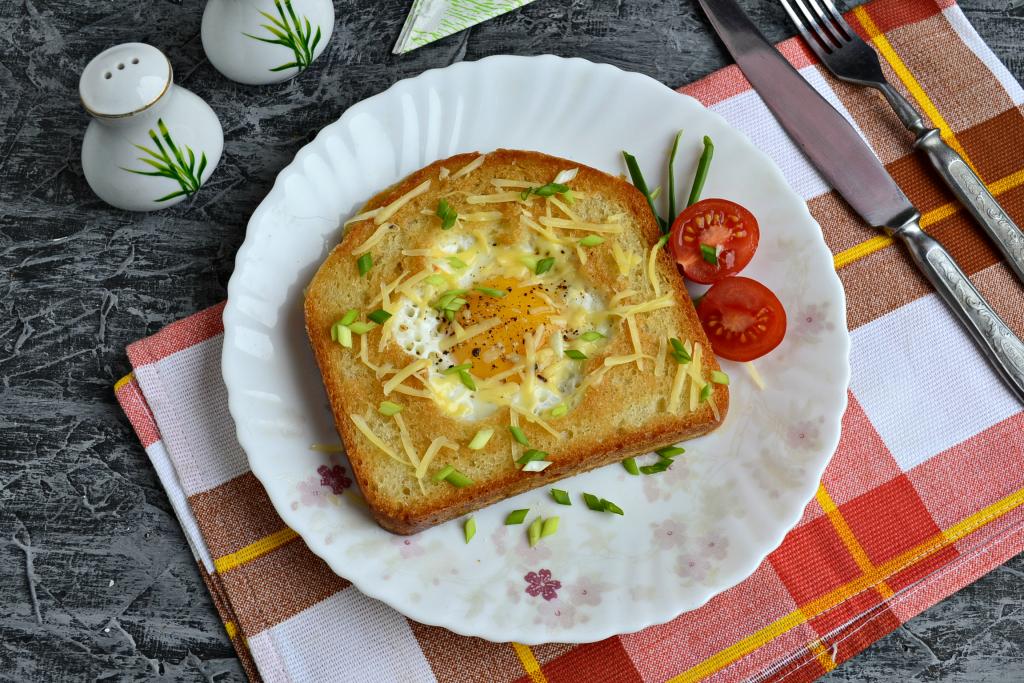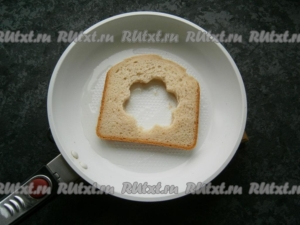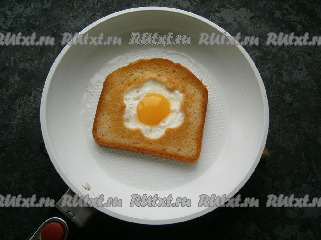 Обжарить хлеб на среднем огне до румяности с одной стороны, перевернуть. Вбить в серединку сырое яйцо, огонь сделать минимальным, прикрыть сковороду крышкой.