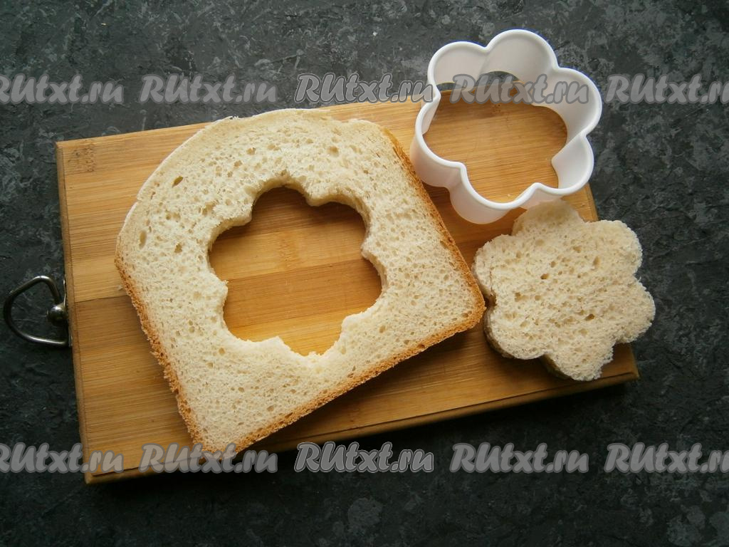 Любой выемкой для печенья или просто стаканом вырезать в хлебе серединку.