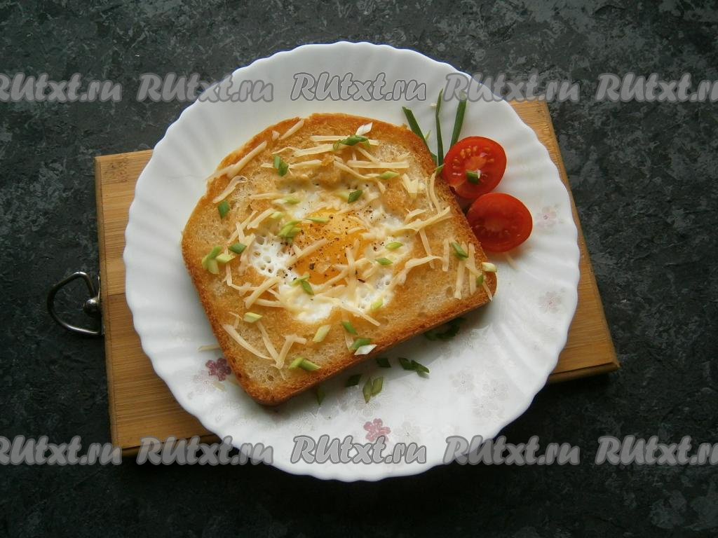 Яичницу, приготовленную в хлебе, переложить со сковороды на тарелку, посолить и поперчить, посыпать натертым сыром и измельченным зеленым лучком.