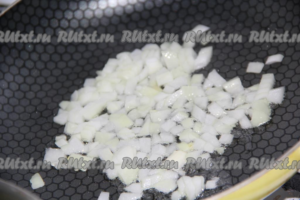 Пока варятся овощи, приготовим зажарку. Очистить лук, свеклу, чеснок и морковь. Мелко нарезанный лук выложить на сковороду с растительным маслом и обжарить на среднем огне 3-5 минут, не забывая иногда перемешивать.