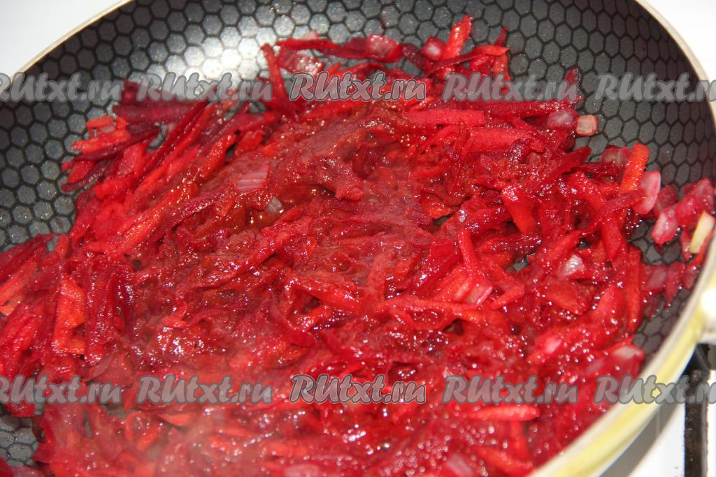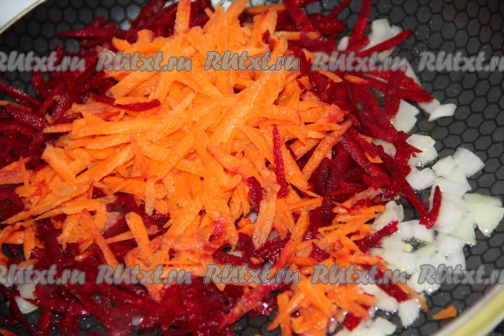 Морковь и свеклу, натертые на крупной тёрке, выложить к обжаренному луку.