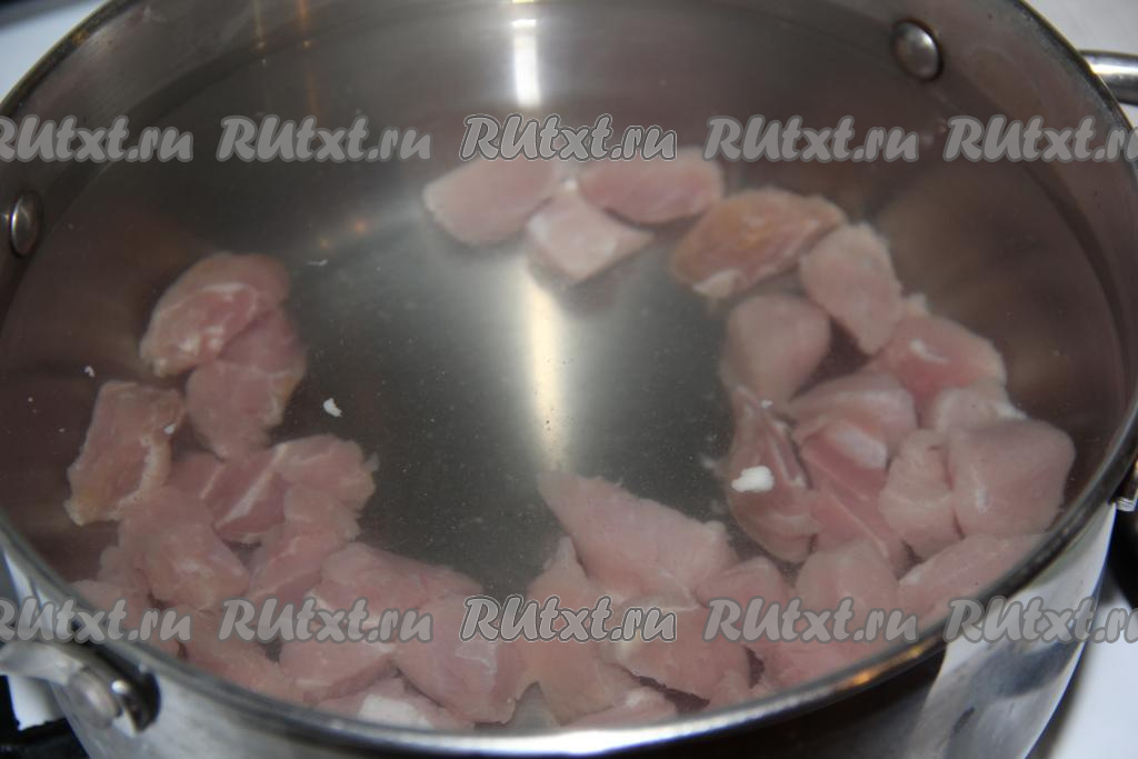 Свинину нарезать средними кубиками, выложить в кастрюлю и залить 2,8 литрами холодной воды.