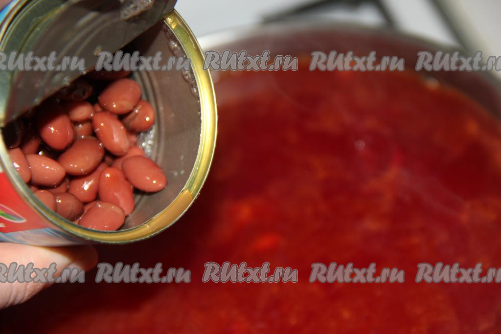 Добавить овощи со сковороды и консервированную фасоль в кастрюлю. Я предварительно слила лишнюю жидкость с фасоли.