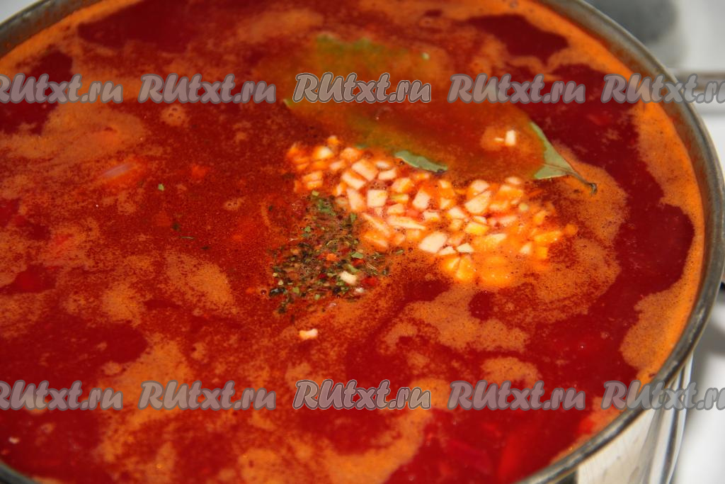 Варить борщ с консервированной фасолью 5-7 минут с момента закипания на небольшом огне, затем добавить соль, специи и измельченный чеснок. Дать закипеть, накрыть крышкой и снять с огня. Обязательно дать борщу настояться минут 20.