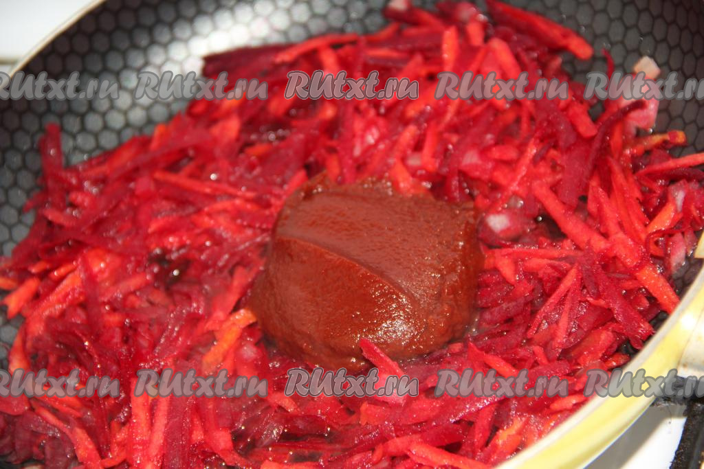 Тушить овощи, иногда помешивая, в течение 10 минут на среднем огне, можно добавить 2-3 столовые ложки бульона из кастрюли. Затем выложить томатную пасту.