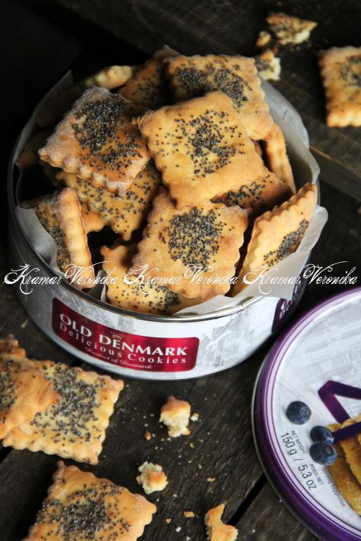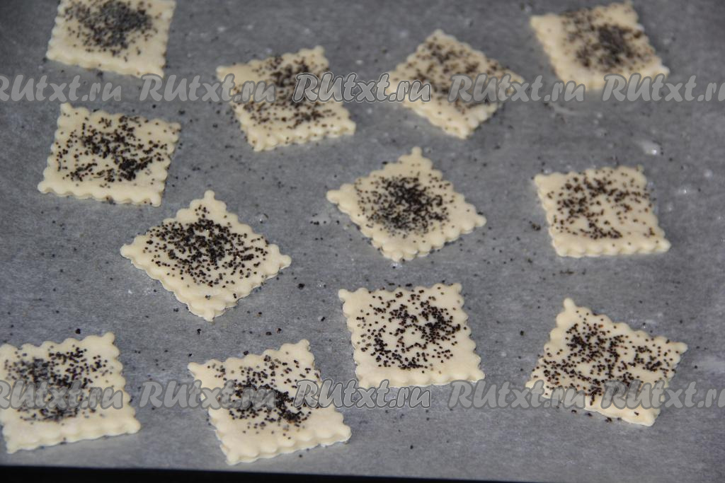 Заготовки печенья смазать водичкой с помощью силиконовой кисти и посыпать маком, кунжутом, семенами чиа, можно сахаром. Чем посыпать - решать вам.