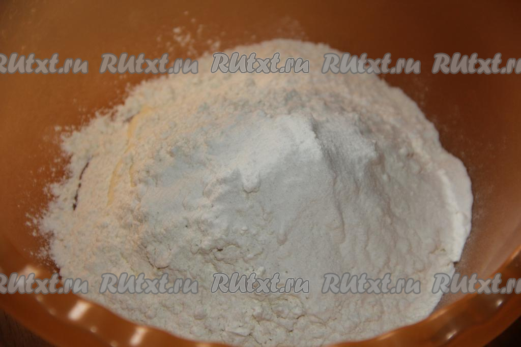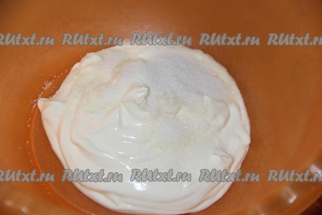 К сметане, смешанной с сахаром, добавить просеянную муку и разрыхлитель.