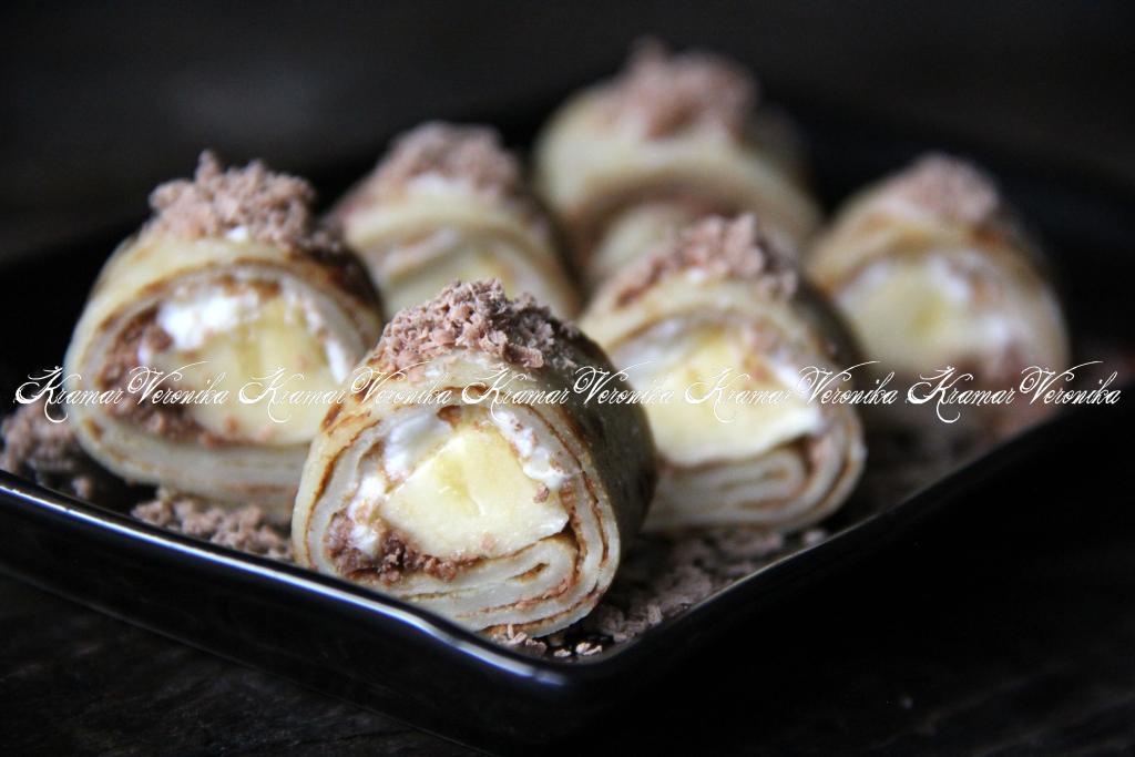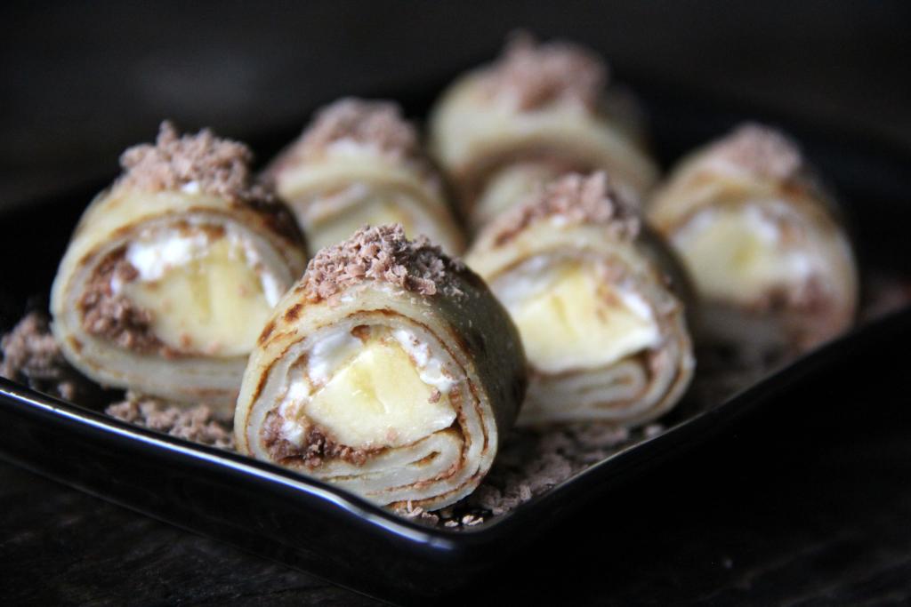 При подаче можно посыпать блинные роллы шоколадом, какао, сахарной пудрой или полить сиропом. Сочетание блинов, творожного сыра и бананов (или других фруктов) - беспроигрышное, поэтому такое блюдо неизменно получается очень вкусным!