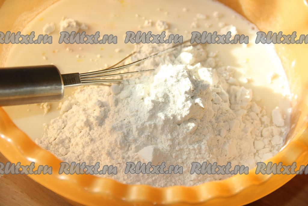 Затем всыпать муку и перемешать венчиком до однородного состояния. В конце влить масло и перемешать. Дать тесту немного постоять (минут 5-10). Тесто получится не густым.