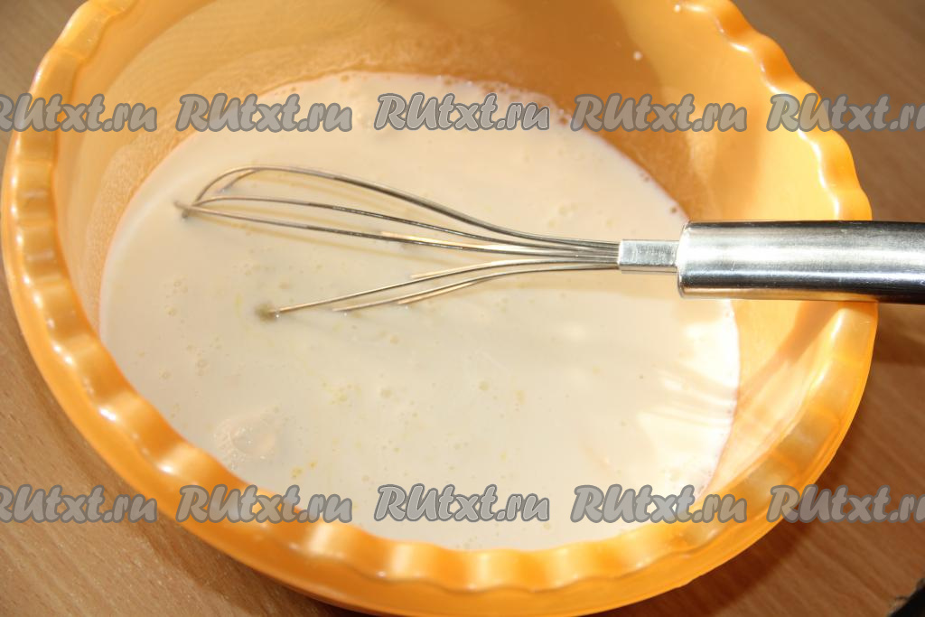 Молоко соединить с яйцом, сахаром и солью, слегка перемешать венчиком.